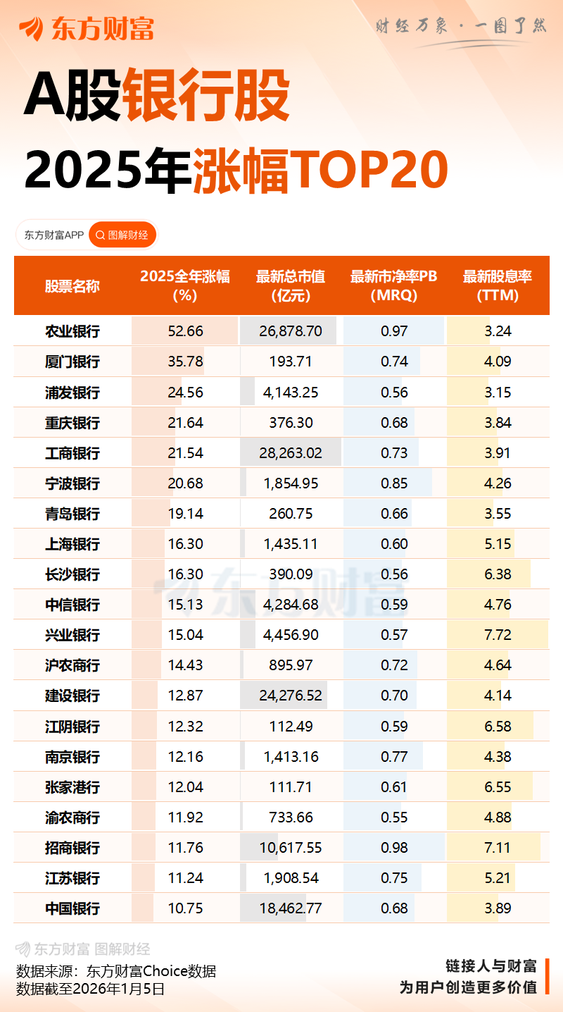 据统计,2025年,农行A股股价年内涨幅52.66%,高居A股上市银行第一;农行H股年内涨幅超过40.8%,同样位列榜首。