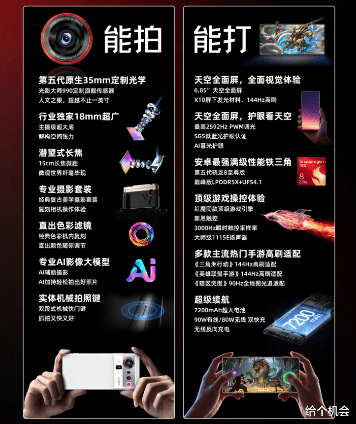还具有出色的拍照能力,采用第五代原生35mm定制光学,主摄采用光影大师990定制传感器,感光性超越一英寸,同时还有行业独家18mm超广角镜头与潜望式长焦镜头,支持15cm长焦微距、AI辅助摄影、试题拍照按键等,还带来了专业的摄影套装,这次在影像方面对比国产大杯了,拍照还是值得期待的。