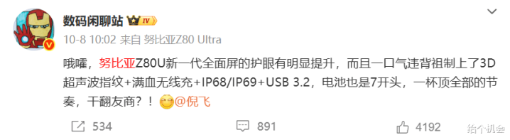 博主数码闲聊站在本月初就爆料过,努比亚z80 ultra将会给到3D超声波指纹+满血无线充+IP68/IP69+UFB3.2,电池容量也升级到7开头,补齐了一些旗舰短板后更为全面了,结合官方公布的参数,综合配置已经很清晰了,续航方面将会采用7200mAh电池+90w有线快充+80w无线快充的组合,并支持无线反向充电功能,续航上还是很不错的。